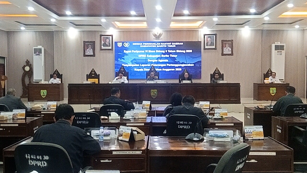 itahpost, BARITO TIMUR – Bupati Barito Timur M. Yamin menyampaikan Laporan Keterangan Pertanggungjawaban (LKPJ) Kepala Daerah Tahun Anggaran 2025 dalam rapat paripurna DPRD Barito Timur yang dipimpin Ketua DPRD Nursulistio, didampingi Wakil Ketua I Mardianto dan Wakil Ketua II Eskop, pada Rabu (25/3/2026). Dalam rapat tersebut, Bupati memaparkan capaian kinerja pembangunan daerah sepanjang 2025 yang menunjukkan pertumbuhan ekonomi 3,9 persen, penurunan kemiskinan menjadi 6,1 persen, serta realisasi pendapatan daerah mencapai 103 persen dari target.